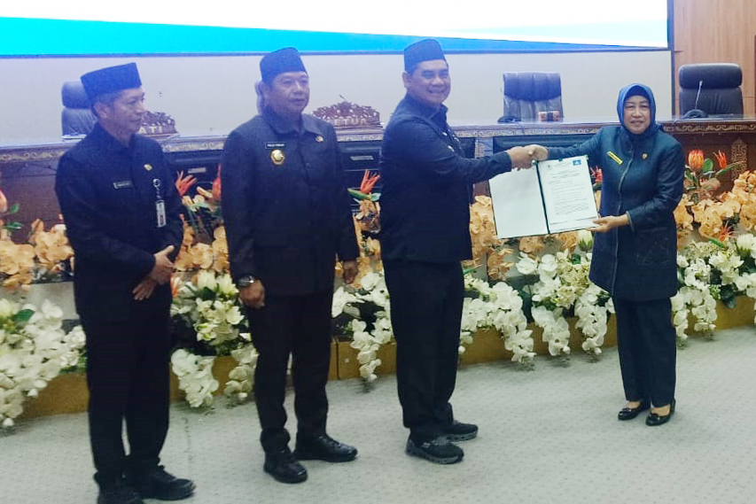 Bupati Kabupaten Barito Utara H. Shalahuddin didampingi Bupati, Wakil Bupati Felix Sonadie Y. Tingan dan Sekretaris Daerah Drs. Muhlis menerima dokumen pemandangan umum Fraksi yang diserahkan oleh Ketua DPRD Hj. Mery Rukaini. (foto : ist)