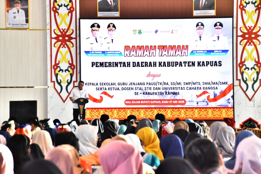 detakkalteng.com, Kuala Kapuas – Pemerintah Kabupaten Kapuas menggelar Silaturahmi dan Ramah Tamah dengan Kepala Sekolah, Guru jenjang PAUD/TK/RA, SD/MI, SMP/MTs, SMA/MA/SMK, serta Ketua, Dosen STAI, STIE dan Universitas Cahaya Bangsa Se-Kabupaten Kapuas dalam Rangka Hari Pendidikan Nasional (Hardiknas) tahun 2025, bertempat di Hall Rujab Bupati Kapuas, Rabu (7/5/2025).