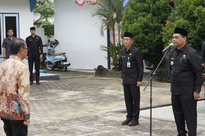 Bupati Barito Utara H. Shalahuddin didampingi Sekretaris Daerah Muhlis saat memimpin apel pagi di DPMTSP setempat