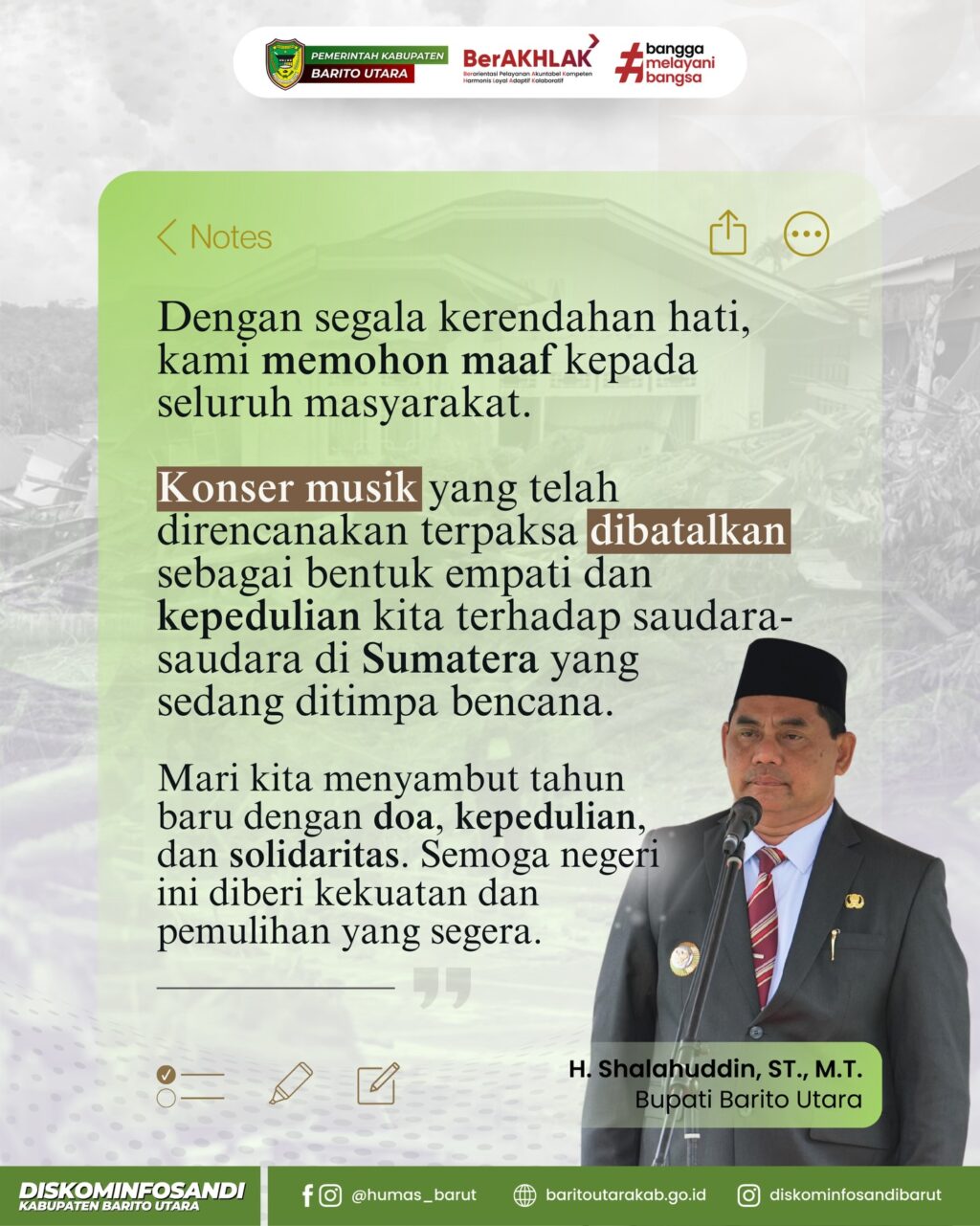 Terkait kondisi duka yang menimpa saudara-saudara kita di Sumatera, konser musik yang telah direncanakan terpaksa dibatalkan. Keputusan ini diambil sebagai wujud nyata empati, solidaritas, dan rasa kebersamaan kita sebagai bangsa.