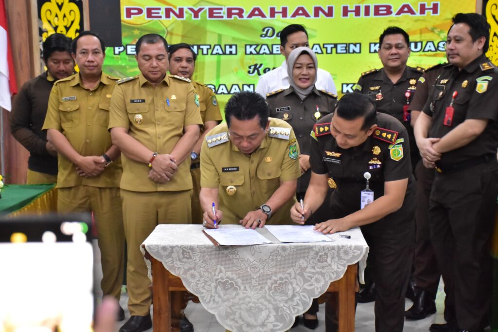 Bupati Kapuas HM Wiyatno Bersama Kepala Kejaksaan Negeri Kapuas Luthcas Rohman saat menandatangani berita acara serah terima pada acara penyerahan hibah kepada Kejaksaan Negeri Kapuas.